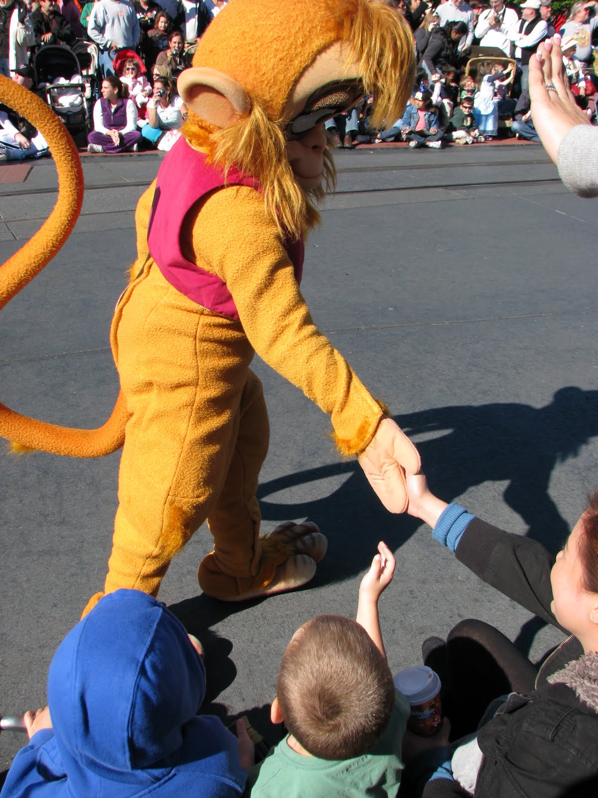 After all this excitement, lunch, and a few other rides, it was PARADE time! I love a good parade y'all! Check out the neat characters we saw--they were so close to us too! A few of them even came over to the boys and touched their head or high-fived them! It was precious!